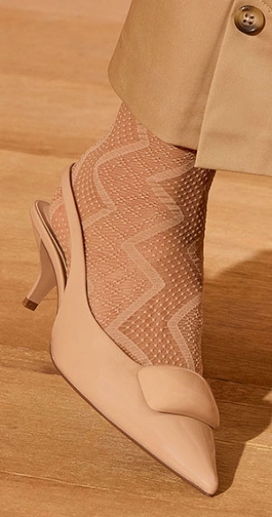 | 足元に、モダンなリズムを刻む。 幾何学的なジグザグ柄が、都会的で洗練された印象を与えるZIGZAG 透け感のあるシアー素材と、柄のコントラストが美しく、履くだけでコーディネートにエッジをプラスしてくれます。 ポインテッドトゥのパンプスやミュールと合わせて、足元からスタイリッシュな存在感を放つ、大人のためのモダンな一足です。 |